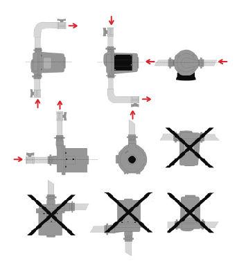 El presurizador deberá ser instalado obligatoriamente de modo que el eje de la electrobomba permanezca en posición horizontal, de acuerdo a las siguientes figuras. El no cumplimiento de esta norma implicará el desgaste irregular del equipo y la consecuente pérdida de la garantía.